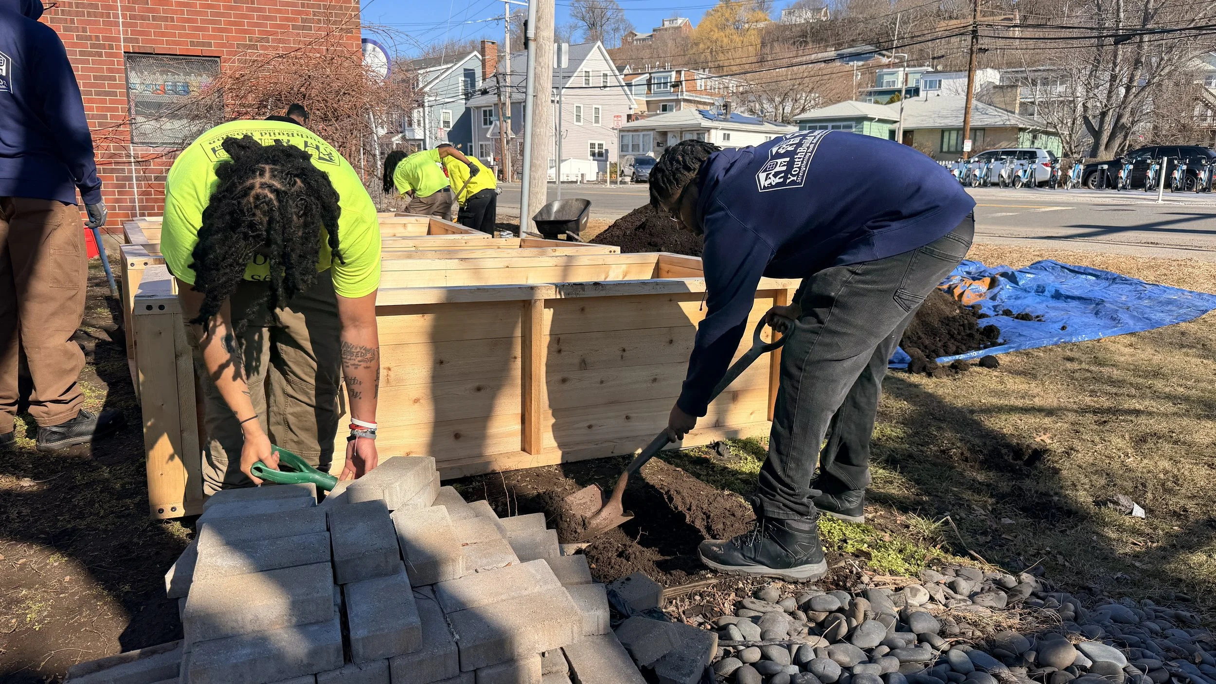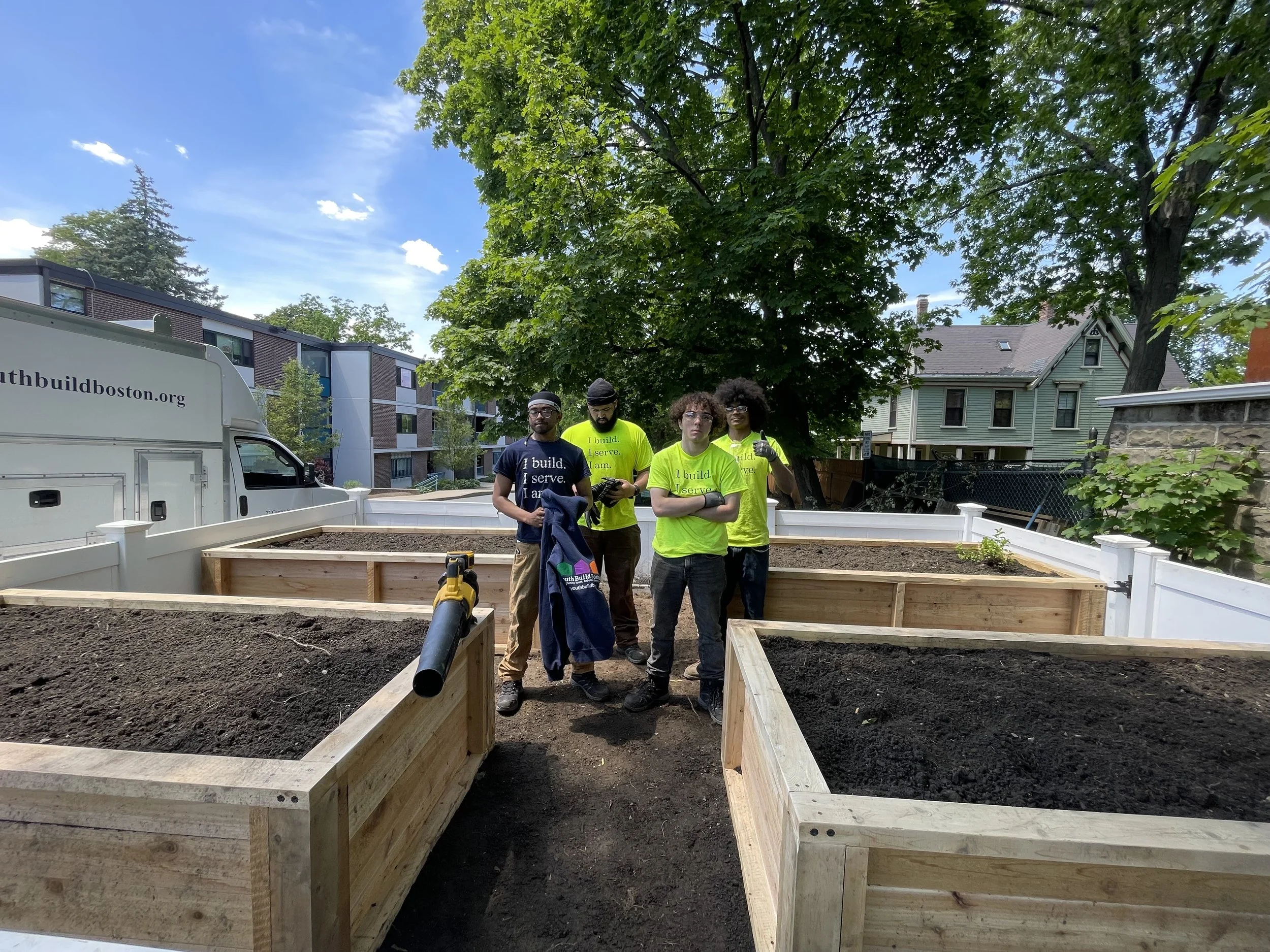 For more than 35 years, YouthBuild Boston has partnered with communities across the city. Our students have contributed to projects such as garden beds, concrete planters, sheds, and other structures for schools, community gardens, and local organizations including Hayley’s House, Grow Boston, Unitarian universalist Urban Ministry, Architecture for Public Benefit, CitySprouts, Fletcher Maynard Academy, William E Russell Elementary School, and more.